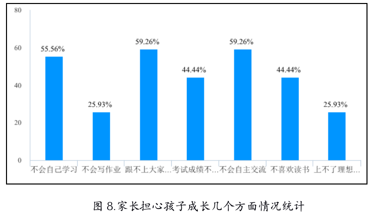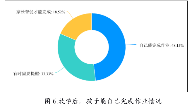 大部分孩子在放学时,家长还在工作。其中85%的孩子参加学校延长托管,课后,有9个孩子是自己或和小伙伴一起回家的;全班有三分之一的孩子回家后是完全自己管理自己的,他们不仅需要完成的学习作业,还需要照顾自己或者弟弟妹妹。目前,全班有8个孩子的学习是由家长全面督促和指导的。(见图6)虽然这几位家长用心指导孩子,但孩子的学习积极性不足,学习能力强,特别是学习态度较松懈。说明,这几位家长的教育理念和方式不适合孩子的意愿和成长。所以,家长学习和家庭教育指导是推进学习型家庭的首要任务。