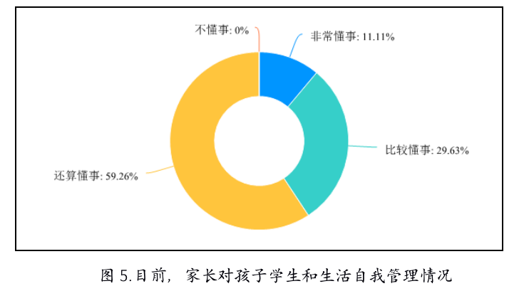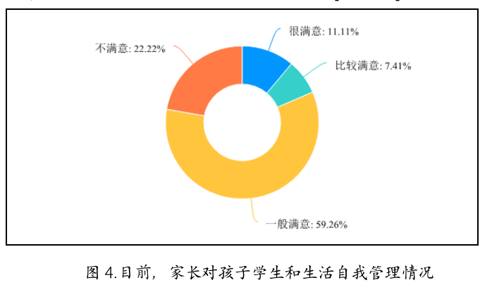 从调查结果看,(见图4)大部分家长是对孩子自我管理状态是满意的,只有22.22%不满意。其实,整个班级学生自我管理意识和能力都存在不足,有三分之一的孩子学习方面比较懒散和随意,能完成的作业做好,不能理解的全部空掉,缺乏求真探索精神。家长还没有意识到随意的学习状态是不利于孩子的整体成长的。