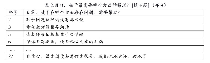 通过上述调查后,(见图8,表2)词汇分析,大部分家长更希望获得来自教师的专业指导和帮助。显然,对于外来务工人员来讲,他们首先要解决的是生存问题,尤其相对于文化程度较低的家长,能让孩子按时上学也是需要付出极大的努力;俗话说:“可怜天下父母心。”,他们也希望孩子能积极向上,有好的学习成绩,有美好的前途,只是他们“心有余而力不足”。