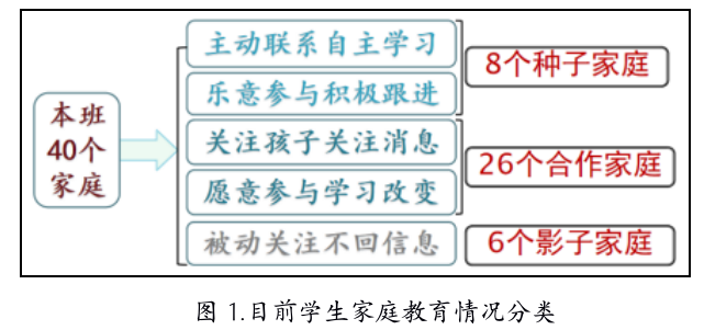 经过“寻找家长”“对话家长”和“家长学习”,从40个家庭,80多个家长中,确定了几位有学习意识和主动思考的家长,成为全班家长和榜样,成为第一批“种子家长”,建立了班级家委会和学习团队。因为,家长与子女的互动,对子女成长的关注和投入是成长过程中至关重要的社会资本。[1]于是,家长才是儿女成长的关键参与者。在家长群里,每天我和种子家长分享简短的学习材料,有教师的专业指导和讲解,还有专家的家庭教育课。让“种子家长”的学习状态和学习方式传递给整个班级。(见图1)经过一周的指导和帮助,有20多个家庭成为“家长学习群体”主要队员,确实让我很有成就感。