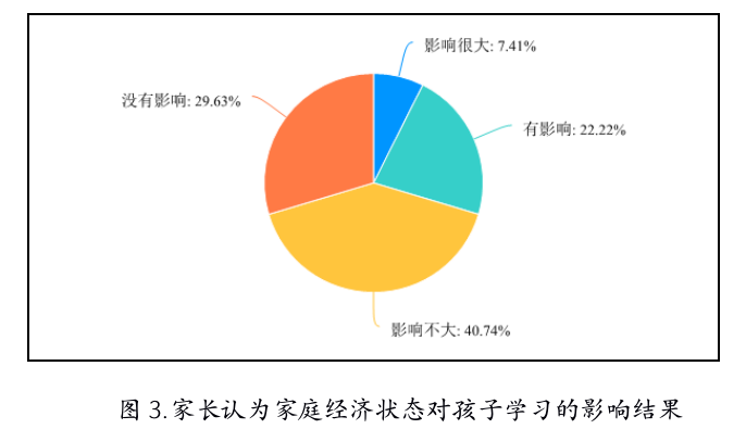 对外来务工人员家庭的经济状态一般处于整个城市平均水平之下,他们大部人都努力工作,想为孩子创造良好的生活环境。但是大部分家长还没有意识到家庭经济状态对孩子成长的影响力有多大。然而,调查结果显示29.63%的家长认为家庭经济状态对孩子的学习“没有影响”,(见图3)有40.74%的家长认为“影响不大”。因此,家庭环境的建设及家庭教育理念提升,仍旧是推进“家庭学习”的主要内容。