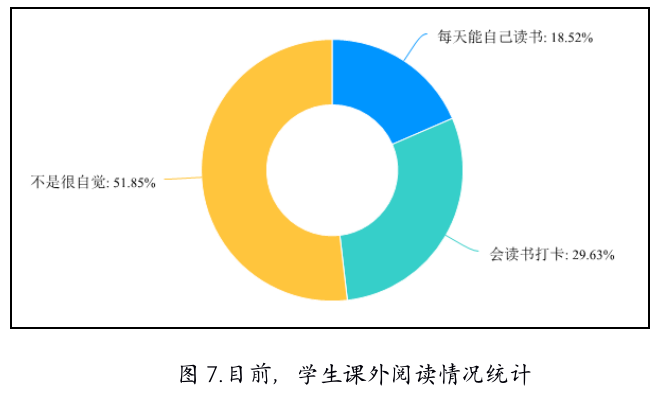 从“课外阅读”情况看,(见图7)能自己每天读书的孩子只占全班人数的五分之一,基本以种子家庭的8个孩子为主,有的孩子也慢慢学会每天读书,但是因为起步晚,学习基础弱,只能以读书打卡为主。尽管家长们有督促和指导,孩子们参与朗读的积极性不高。