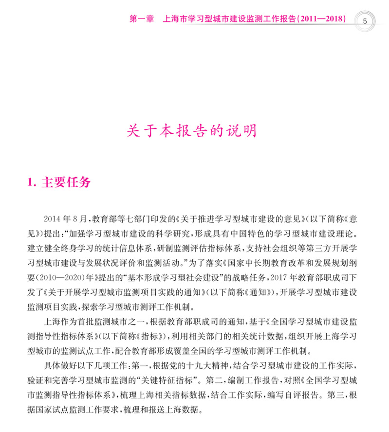 学习型城市建设已成为各国开发人力资源、提高经济竞争力、实现社会可持续发展的重要战略。中国正处于社会转型发展的关键时期,“加快建设学习型社会”成为新时期的重要任务。上海市正全力建设卓越的全球城市和具有世界影响力的社会主义现代化国际大都市。在新的发展形势下,上海市将积极提升学习型城市建设的能级,努力建成学习型城市治理“先行区”,构筑面向未来的学习型城市“创新区”,打造市民智慧学习的“普惠区”,构建学习型城市国际“交流区”。