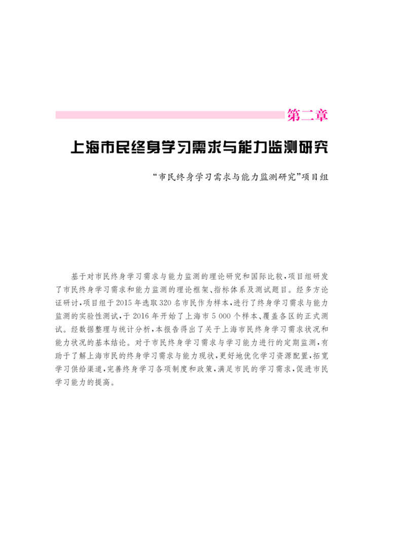 基于对市民终身学习需求与能力监测的理论研究和国际比较,项目组研发了市民终身学习需求和能力监测的理论框架、指标体系及测试题目。经多方论证研讨,项目组于2015年选取320名市民作为样本,进行了终身学习需求与能力监测的实验性测试,于2016年开始了上海市5000个样本、覆盖各区的正式测试。经数据整理与统计分析,本报告得出了关于上海市民终身学习需求状况和能力状况的基本结论。对于市民终身学习需求与学习能力进行的定期监测,有助于了解上海市民的终身学习需求与能力现状,更好地优化学习资源配置,拓宽学习供给渠道,完善终身学习各项制度和政策,满足市民的学习需求,促进市民学习能力的提高。