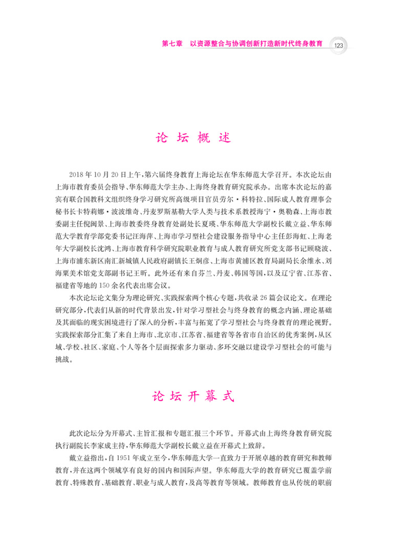 2018第六届终身教育上海论坛在华东师范大学召开。围绕着“新时代的终身教育:资源整合、协同创新”的论坛主题,150余名来自国内外不同领域的研究者、决策者和从业者分享了终身教育与学习型社会领域的理论研究与实践经验。通过对本次会议上各个代表发言内容的梳理与总结,能够丰富对“如何拓展城市的学习环境”“如何发挥大学在学习型城市建设中的作用”“如何为终身学习者建立多样化的教育合作机制”等问题的认识与理解。