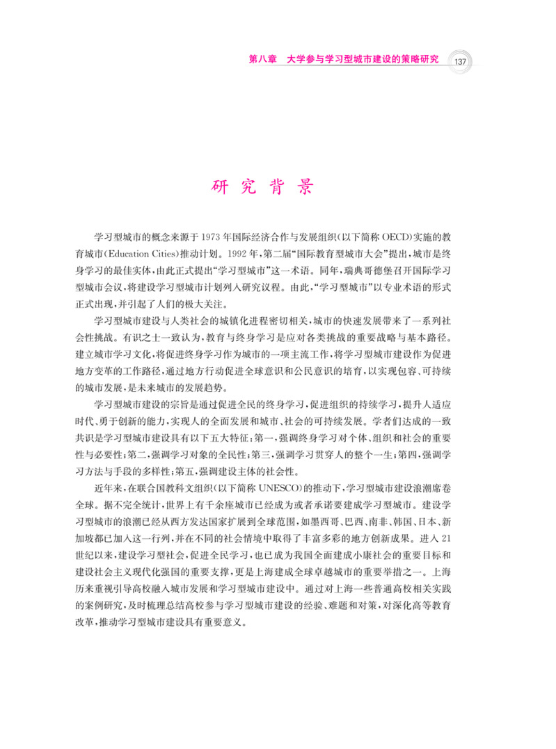 高校在学习型城市建设中应发挥什么样的作用以及如何发挥作用,这一话题近来得到了越来越多的关注。借鉴上海高校参与学习型城市建设的有益经验,本文指出,高校可以在学习型城市建设中发挥引领、服务、协同和反哺的作用,但是高校参与学习型城市建设的宏观环境不成熟和内驱力不足等因素制约了其作用的发挥。因此,本文强调,应该通过加强理论创新、开放教育资源、搭建参与平台、形成内生动力等策略,有效发挥高校自身优势,为更多人提供持续学习、终身发展的机会,从而为学习型城市建设作出高校应有的贡献。