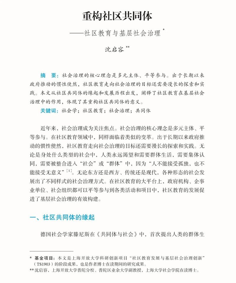 《重构社区共同体——社区教育与基层社会治理》以社会学的视角发现,通过社区教育营造出的社区群体生活为切入口,有助于重构熟人社会,增进社会资本,促进社会整合,为基层社会治理创新提供新的思路和方向。