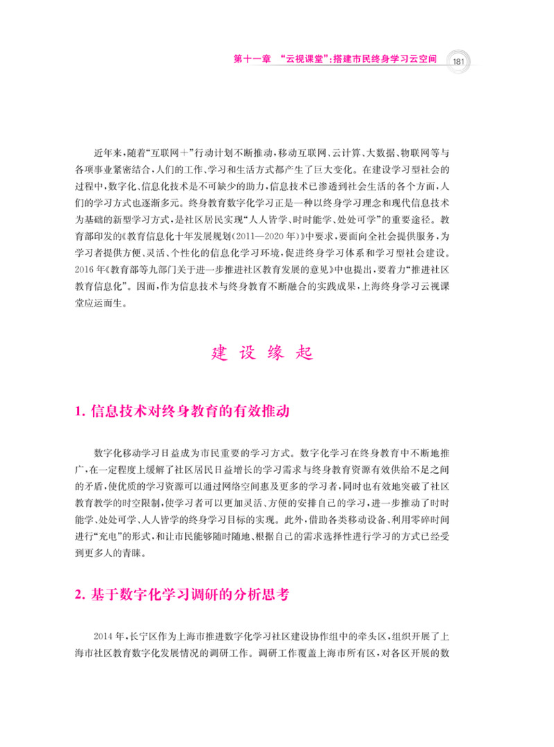 在信息技术飞速发展、各类数字化基础设施不断完善以及市民的数字化学习需求激增的现状下,终身学习云视课堂作为一种数字化学习方式应运而生。自2015年以来,云视课堂经过试点、推进、全覆盖等阶段,在体制机制建设、教育教学方式创新、技术服务保障等方面均取得了一定的成果,并在2018年实现了全市16个区全覆盖。云视课堂作为一种以“一对多、去中心、可移动、云存储”为突出特点的教学方式,有效解决了社区教育场所不足和优质师资紧缺等问题,同时在对口帮扶和老年教育领域发挥出重要作用。终身学习云视课堂从无到有的建设过程,不仅帮助市民突破了参与数字化学习的瓶颈,促进了优质教育资源的整合融通,而且打造出补充传统学习方式的数字化学习新模式,使得学员能够通过在线的方式加入云端课堂进行学习,是对教育现代化建设的积极响应。