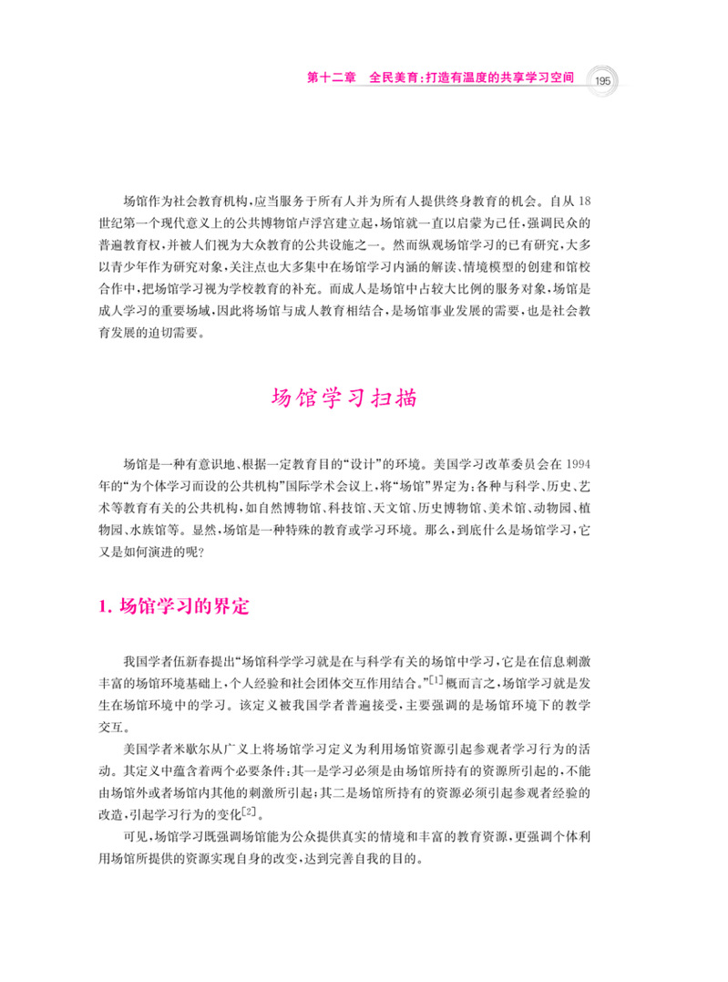 近年来,随着终身教育、终身学习及学习型社会等理念的不断发展,一种终身学习方式——场馆学习,引发社会各界广泛关注。刘海粟美术馆积极发挥场馆教育功能,通过重塑社区空间、接续雅集精神、展厅变课堂等多项富有创意且扎根社区生活的美育活动,逐渐丰富着场馆学习的实践样态,弘扬着美育精神。在阐述场馆学习内涵与演进的基础上,以终身教育的视野审视刘海粟美术馆“全民美育”的实践,发现其在提升市民参与度,增强自身服务能力,营造有温度的共享学习空间等方面卓有成效,同时也需要进一步探索场馆工作人员的自我导向学习、场馆学习的成果评估、以场馆为桥梁的家校联动、场馆学习项目的长效性和持续性以及馆际合作等问题。