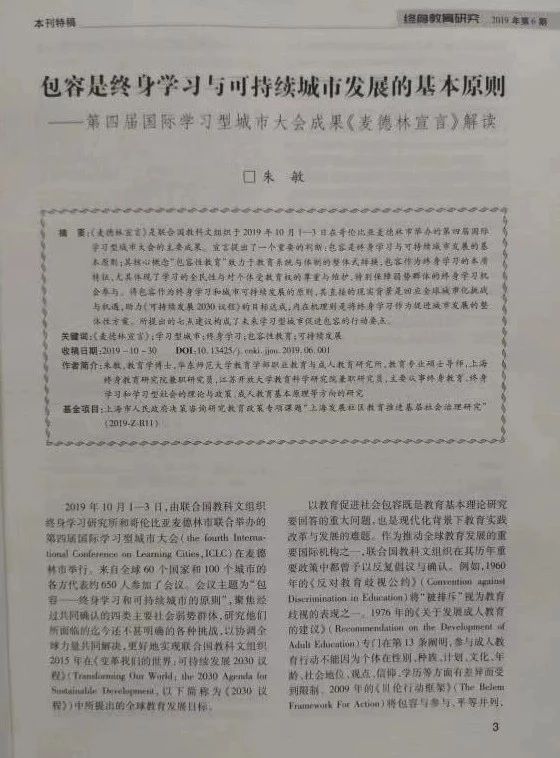 学习型城市一直是上海终身教育研究院的主体研究内容,也是上海市2019年加入全球学习型城市网络(Global Network of LearningCities,GNLC)之后,以“可持续发展”专题协调员身份和合作伙伴德国汉堡市在未来两年需要共同推进的重点工作。为了及时、准确地理解联合国教科文组织在学习型城市推进过程中的新动向,了解国际学习型城市发展动态,华师大教育学部职成所教师、上海终身教育研究院兼职研究员朱敏博士以此次国际会议的主要成果之一《麦德林宣言》(Medellín Manifesto)及其背景报告为内容,于11月11日在文科大楼707向与会人员作了集中解读与分享。研究成果《包容是终身学习与可持续城市发展的基本原则》发表在《终身教育研究》2019年第6期特稿专栏。