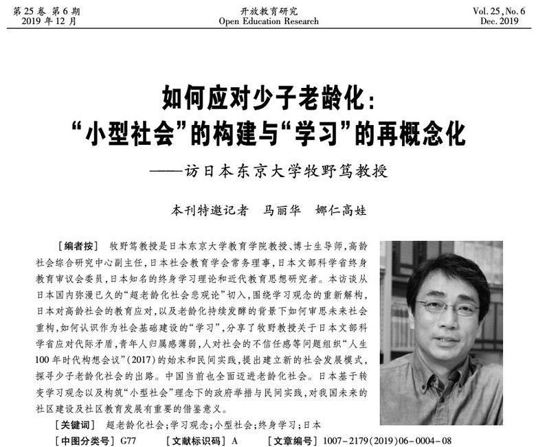 本访谈从日本国内弥漫已久的“超老龄化社会悲观论”切入,围绕学习观念的重新解构,日本对高龄社会的教育应对,以及老龄化持续发酵的背景下未来如何审思社会重构,如何认识作为社会基础建设的“学习”,分享了牧野教授关于日本文部科学省应对代际矛盾,青年人归属感薄弱,人对社会的不信任感等问题组织“人生100年时代构想会议”(2017)的始末和民间实践,提出通过建立新的社会发展模式,来探寻少子老龄化社会的出路。中国当前也全面迈进了老龄化社会。日本基于转变学习观念以及构筑“小型社会”理念下的政府举措与民间实践,对我国未来的社区建设以及社区教育的发展有重要的借鉴意义。