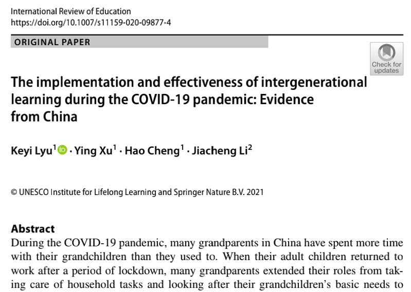 在此之前,上海终身教育研究院已在隔代学习研究领域做了诸多探索。例如,《共学互学:论终身教育体系中的主体间关系》(李家成、程豪,发表于《终身教育研究》2020年第6期)一文从“互学互鉴”的角度反思了当下终身教育体系中割裂的主体间关系,并指出应当恢复不同教育时段、不同教育类型间的主体间共学互学关系,该文促进了隔代学习与终身教育领域的理论发展与思维转向。再如,《“跨域”学习可以促进小学生怎样的发展?》、《隔代学习实现老人和儿童的共学互学》等系列研究报告(程豪、李家成、丁小明等,收录于《中国终身教育研究(第一辑)》),更是基于对一个具体的隔代学习项目试验——龙虎塘实验小学与河海老年大学的共学互学隔代学习项目实验(2019年1月-)——的过程投入与跟踪研究,深入地分析了隔代学习对不同主体的价值、隔代学习的实践模式等,具有一定的理论价值与开创意义。