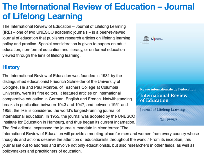 刊登该文的杂志《国际教育评论》(IRE)属于联合国教科文组织终身学习研究所,由斯普林格出版社出版发行,是一本高质量的同行评议(peer-review)教育杂志,其在终身教育、成人教育、开放和远程教育、职业教育和工作场所学习等研究与实践领域具有广泛影响力。