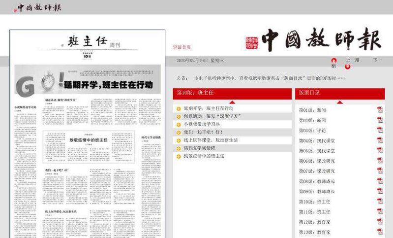 在“延期开学,班主任在行动”专版及“课堂教学”版中,刊发了上海终身教育研究院李家成教授、浙江省武义泉溪小学涂淑莉老师、上海市临港实验中学董雪梅等人的成果。其他研究成果也将陆续在相关版面刊发。