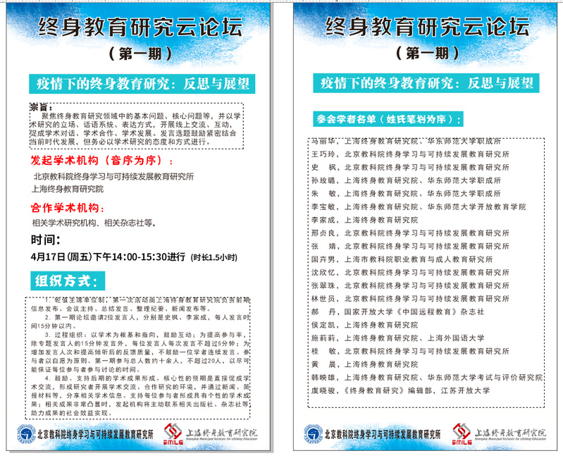该论坛将持续进行,聚焦终身教育研究领域中的基本问题、核心问题等,以学术研究的立场、话语系统、表达方式开展线上交流、互动,致力于促成学术对话、学术合作、学术发展。近期,该论坛将聚焦“疫情下的终身教育研究”主题持续开展。