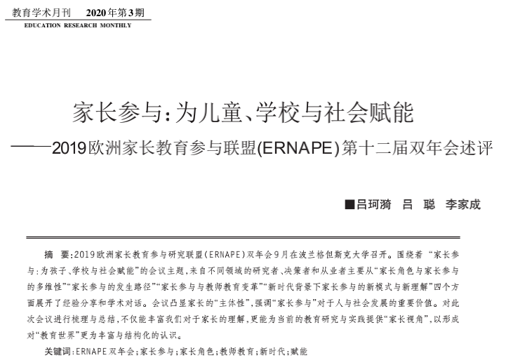华东师范大学教育学系博士研究生吕珂漪、硕士研究生吕聪与上海终身教育研究院李家成教授等合作,在《教育学术月刊》发表了题为《 家长参与:为儿童、学校与社会赋能 ——2019欧洲家长教育参与联盟(ERNAPE)第十二届双年会述评》一文。