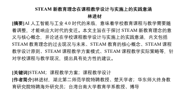 林进材教授于《新课程评论》(2020年第4期)发表《STEAM 新教育理念在课程教学设计与实施上的实践意涵》一文。本文指出在人工智能与工业 4.0 的时代背景下,学校教育课程与教学需要及时调整,顺应时代变革。本文阐明了 STEAM 新教育理念的意义与核心概念,并论述了其在学校课程教学设计与实施上的实践意涵。