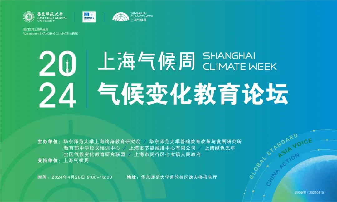 2024年4月26日,由华东师范大学上海终身教育研究院、华东师范大学基础教育改革与发展研究所、教育部中学校长培训中心、上海市节能减排中心有限公司、上海绿色光年、全国气候变化教育研究联盟和上海市闵行区七宝镇人民政府联合主办,上海气候周支持的“气候变化教育论坛”在华东师范大学举行。该论坛吸引了一百余位全国各类教育领域的专家学者、关注气侯变化的企业和社会组织代表及媒体代表参会。