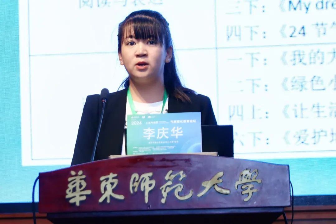 北京市房山区良乡中心小学李庆华校长委派教师董剑梅做了题为《让气候变化教育融入学生的学习生活》的分享,以“行于实,方乃成”办学理念为引领,“融合共生”为推进思路,将气候变化教育与校园环境融合,营造教育氛围;与学科教学融合,实现协同育人;与校家社活动融合,拓宽实践场域,不断推进气候变化教育。