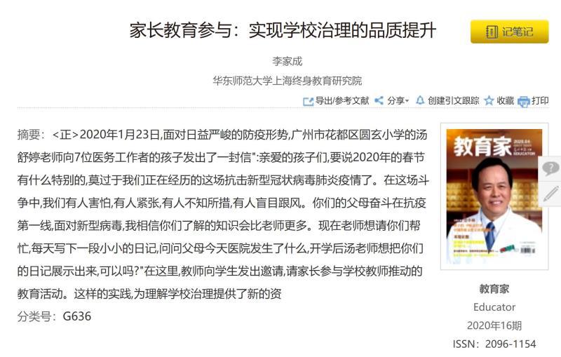 此外,李家成教授在《教育家》(2020年16期)发表《家长教育参与:实现学校治理的品质提升》一文。此文源于广州市花都区圆玄小学的汤舒婷老师向7位医务工作者的孩子发出的一封信,引发了关于“家长教育参与”与“学校治理”的思考,探讨了“家长教育参与”对于“学校治理”的必要性和重要性,启发教育工作者“自我超越”,让“家长教育参与”继续促成学校治理体系与治理能力的现代化。