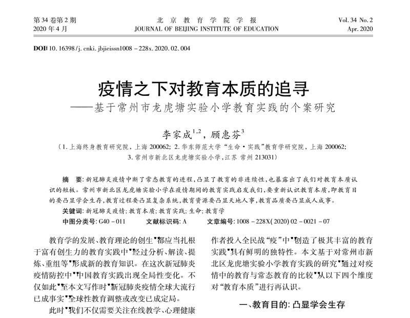 上海终身教育研究院执行副院长李家成教授在《北京教育学院学报》(2020年4月)发表了题为《疫情之下对教育本质的追寻——基于龙虎塘小学教育实践个案研究》一文。本文基于常州市新北区龙虎塘小学在疫情期间的教育实践,通过对疫情中的教育与常态教育的比较,分别从“教育目的”、“教育过程”、“教育资源”和“教育品质”四个维度 对“教育本质”进行再认识,从教育学的立场审视疫情中的教育实践,发现并直面“教育问题”,形成更合理的教育思想。