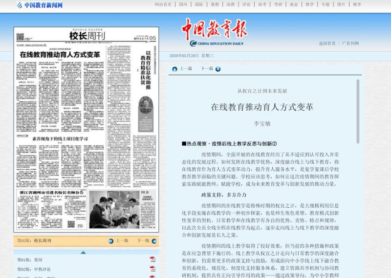 2020年5月20日《中国教育报》刊登了上海终身教育研究院兼职研究员、华东师范大学开放教育学院李宝敏教授题为《在线教育推动育人方式变革》一文。疫情期间,全面开展的在线教育经历了从不适应到认可投入并常态化的发展过程。文章探讨了如何发挥在线教学优势,深度融合线上与线下教育,将在线教育作为育人方式变革动力,提升育人服务水平,让疫情期间的教育探索实践赋能教师、赋能学校,成为未来教育变革与创新发展的推动力量。