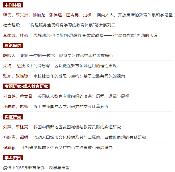 上海终身教育研究院李家成教授与程豪博士生在《终身教育研究》(2020年第3期)联合发表了题为《思想观念·价值取向·思想方法·发展战略——对“终身教育”内涵的认识》一文,此文基于对经典著作《终身教育引论》、《学会生存》的再解读,从“思想观念”、“价值取向”、“思想方法”和“发展战略”的视角去阐释“终身教育”的内涵,试图说明其不是一个平面化的概念,而是一个具有立体感的概念。此外,在本期杂志“学术资讯”栏目中,我院李家成教授和北京教科院终身学习与可持续发展教育研究所史枫也为此栏目供稿:《疫情下的终身教育研究:反思与展望》,文章立足4月17日由北京教科院终身学习与可持续发展教育研究所、上海终身教育研究院联合发起、组织的首期终身教育研究云论坛,参与论坛的近20位研究者在理论、政策、实践等层面展开了多元交流讨论,而后形成了关于终身教育在应对疫情中的“不确定性挑战”、“表达力量”、“反思”以及研究者“群体自觉”等主题的聚焦。