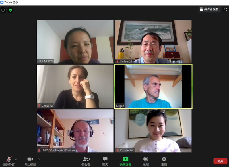 2020年6月17日下午,UNESCO终身学习研究所(UIL)可持续发展教育第六次在线工作会议举行。来自UNESCO总部的Bernard Combes, 来自UIL的Mo Winnie Wang,Christina Drews和Viviane Sun,来自汉堡市的Jürgen Forkel-Schubert,和上海终身教育研究院李家成参加了会议。