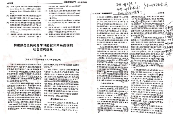 开始阅读具体文章了,我照例从了解大概开始。第一篇是朱敏老师写的《如何理解作为体系的终身教育》,我分别浏览和圈画了大标题和小标题。第二篇是张永老师写的《构建服务全民终身学习的教育体系面临的社会结构挑战》,在浏览标题的过程中,我收获了第一个“惊喜”,这篇文章能解答我在阅读“摘要”中产生的第一个困惑。我很开心,开始了细细阅读,期待找到答案。