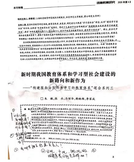 近日阅读杂志《终身教育研究》2020年第4期,读完本刊特稿华东师大博导李家成教授的“主持人语”,作为一个教育工作者的我迫切想知道:面向每个人、适合每个人、更加开放灵活的教育体系是怎样的,在当前统筹推进疫情防控和经济社会发展工作中,终身教育和学习型社会建设如何在危机中育新机、于变局中开新局呢?带着满满的阅读期待,我开启了阅读《新时期我国教育体系和学习型社会建设的新路向和新作为——“构建服务全民终身学习的教育体系”笔会系列三》的旅程,该组文章作者共5人,分别是朱敏,张永,马丽华,韩映雄,李家成。