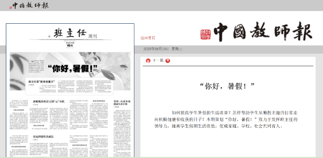 8月19日出版的《中国教师报》以专版介绍了“你好,暑假!”项目的若干成果,刊出了李家成、张莉、夏虹、陈才英、费玲妹等项目组成员的研究成果。