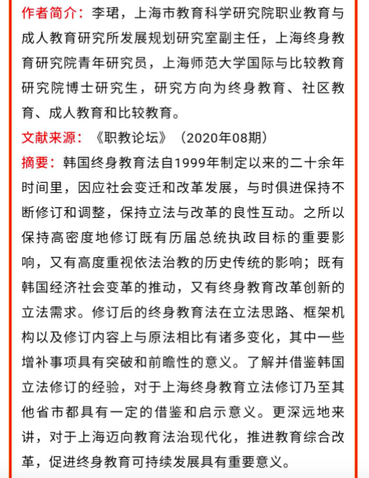 上海市教科院职成教研究所发展规划研究室副主任,上海终身教育研究院青年研究员,上海师范大学国际与比较教育研究院博士研究生李珺于《职教论坛》(2020年第8期)发表《韩国持续修订终身教育法的动因、主要变化及政策启示》一文。该文主要探讨了韩国高密度修订《终身教育法》的动因,以及历次修订的《终身教育法》在立法思路、框架结构以及修订内容上的诸多变化,其中一些增补事项具有突破和前瞻性意义,对于上海终身教育立法修订乃至其他省市立法都具有一定的借鉴和启示意义;更深远地来讲,对于上海迈向教育法治现代化,推进教育综合改革,促进终身教育可持续发展,具有重要意义。