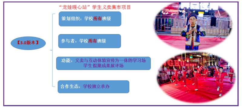【3.0版本】:2020年暑假,后疫情时期,我们的全校学生以相似的推进模式参与了街道在环球港的夜市,又一次策划组织了升级版的龙娃暖心站爱心义卖,本次义卖是我校少儿玩伴爱心志愿公益校本课程的社会化实践尝试,既为学生提供实践锻炼、奉献爱心的平台,又是我校学生暑期生活成果的阶段展示,共分为项目体验区、实物义卖区和公演区,产品主要涉及国学文创、科创制作以及才艺节目,还将学生为主体的“一带一头盔”的公益宣传融入其中。在展示与评价的活动过程中不仅提升学生综合素养,培养学生公益精神,还呈现学生精彩幸福的假日生活,建立相互交流与学习场域。至此,“龙娃暖心站”项目跨越成为以社区为中心的,家校社企多主体共学互学的真实学习体验场,也成为了我们学校原有的期初展评博览会,但是这个期初展评的环境更加开放与真实,也带给学生更多挑战与成长。