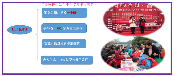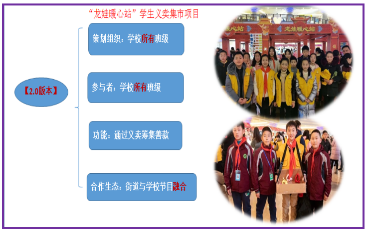 【2.0版本】:2020年冬,全校每个班级每个孩子全员参与策划摊位的产品与义卖,在老师和家长志愿者的组织下,他们组建爱心玩伴团,准备产品。各班形成了义卖产品的策划与论证、生产与销售培训常规活动,“龙娃暖心站”已经成为我校学生参与社区文化治理的经典项目活动,也为我校2020“你好,寒假!”项目推进拉开了序幕 ,衔接起学生的寒假生活。这次义卖中,街道与我校的公演节目进行了整合。各年级义卖所得将作为年级公益基金的启动资金,用于寒假以及开学后各年级自主策划和组织爱心公益类假体玩伴团活动。至此,“龙娃暖心站”这个项目关注活动的长程推进,充分挖掘了活动的育人资源,引领我校学生作为社区小主人“我为人人”奉献、服务意识的深化,提升了学生组织策划力、沟通交往力、合作创新力为核心的领导力。这一爱心志愿公益活动也逐渐发展成我校少儿玩伴系列校本课程之一。
