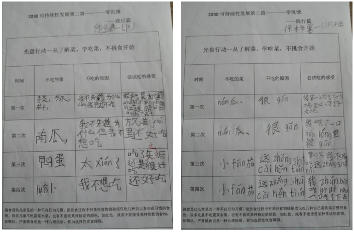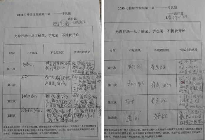 老师: 那我们从现在开始“挑战一下自己”,不吃的蔬菜学起来吃一口,尝尝看什么味道,如果没问题就吞下去,实在吃不了就吐到餐巾纸上。