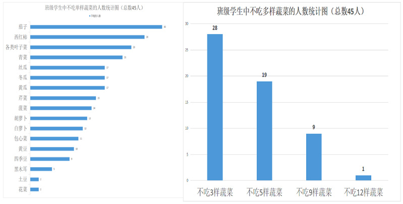 为了真实地了解孩子们的就餐情况,我向家长们做了一个表格式调查。结果显示,全班总人数45人,一点也不挑食的3人,占0.6%;部分挑食的,主要有很多蔬菜不吃的,全班30人,占67%;很挑食、几乎不吃蔬菜的,全班9人,占2%;还有3人,不爱吃饭。