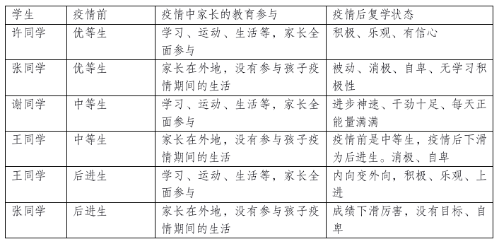 在研读李教授的《家长教育参与:实现学校治理的品质提升》一文中,我看到了家长教育参与的版本升级,观照现实中学生的发展,我们不难发现:2.0版的家长教育参与在疫情期间发挥了不可估量的作用。我特别抽取了本班学生家长教育参与中不同类型学生的发展的状况做出对比,从而得出家长教育参与的不可替代性。