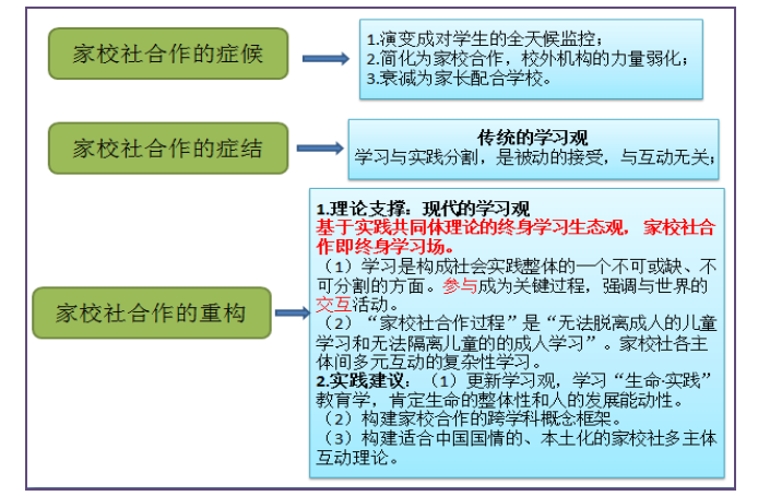 李教授推荐的第二期三篇文章其实在第一周已经读完,根据影响很深刻的部分,我整理了我获取到的重点,将这些重点形成了我的学习思路,我想这应该是属于理论知识内化的过程吧。家校社合作的现状是怎样的?形成原因有哪些?如何重构家校社合作生态?在《家校社合作的反思与重构:基于实践共同体的视角》一文中有很清晰的建议阐述。