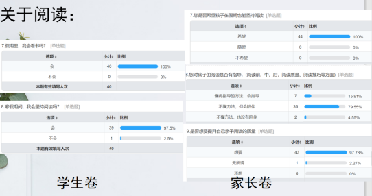 为了解学生和家长对待阅读的看法和困难,为后期更好地开展阅读活动,我们面向一(3)班45位学生及他们的家长,进行了问卷调查。以此来了解阅读现状、问题与需求,结合这些在与班级群讨论,商讨多样的阅读活动。
