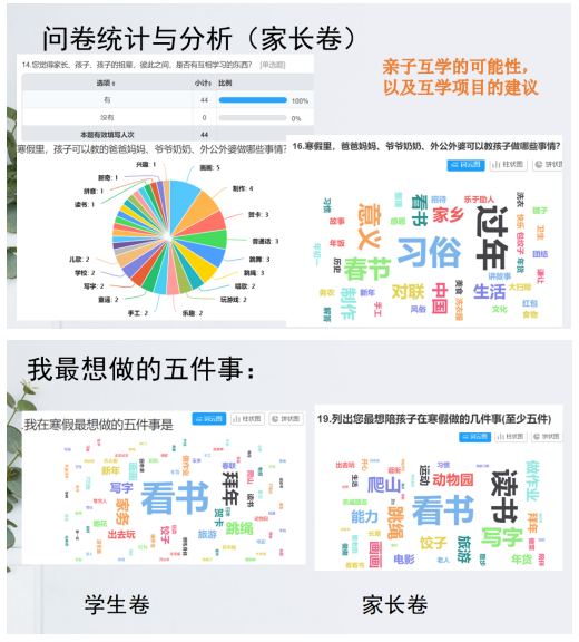 为了更好地促进学生寒假生活的健康转变,我们在学生和家长两个层面开展了问卷调查和采访。从调查中,我们了解到学生和家长关注的寒假的关键词有:开心、年俗、陪伴、献爱心、旅行、家务、学习、团圆等。比较聚焦的是“阅读”、“年俗年味”、“了解家乡”、“学习”,这几个主题。通过问卷,我们也了解到:1.发现母亲的参与度明显比父亲高,然后父亲对于儿童成长有着非常重要的作用。本学期,我们一直在致力于引导父亲参与家校合作。2.大部分学生有阅读的习惯,但却并不清晰阅读的质量。家长层面有明显坚持阅读和提高阅读质量的的态度。3.认为亲子之间存在互相学习的东西。4.认同了解年文化的重要性,认为家乡年的独具特色,并提供了很多了解年文化的方式。