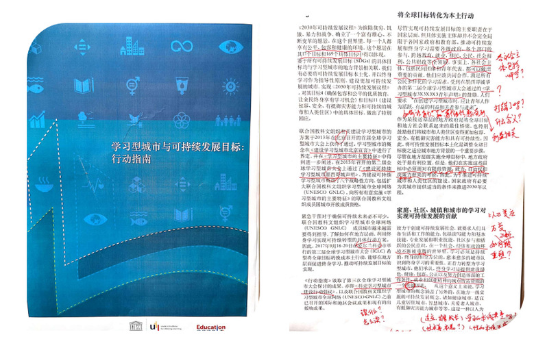 因此,很感谢能读到这几份材料。“《学习型城市与可持续发展目标》是一个行动指南,旨在将终身学习融入主流,使之成为实现十七个可持续发展目标的一个关键驱动。这个文件通过展示具体的步骤,寻求促进将全球目标转化为地方行动的进程”。