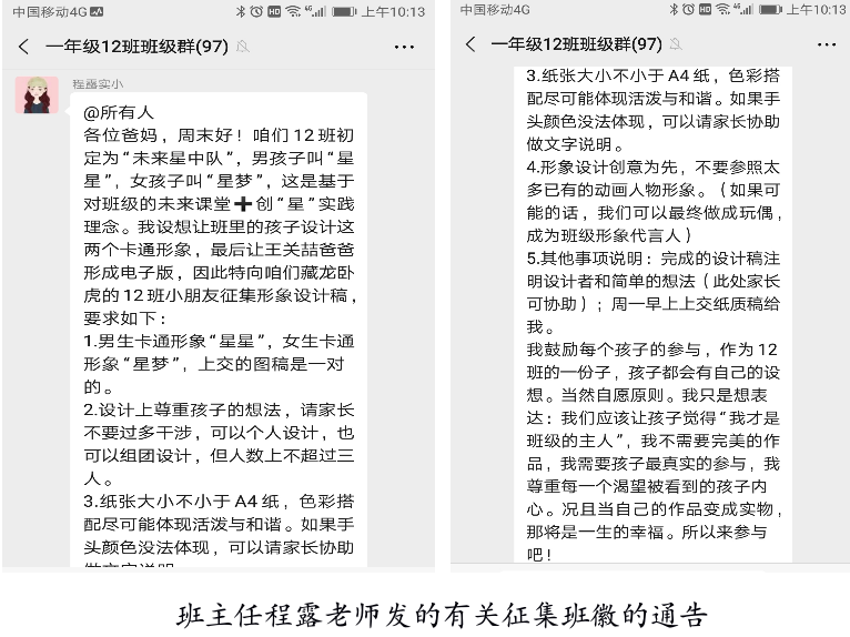 程老师看似普通的提议,其实是蕴含着教育智慧的。如果没有程老师先进的理念,就不会发生这样美好的教育故事。这样的事例还有很多,我作为家长又作为班主任的同时,真的从程露老师身上学到了很多,也是越来越敬佩程老师。她绝对不是普通的简单的一年级班主任、小学教师,她称得上是一位教育家。能够遇到这样的老师,就是家长和学生的幸运。包容是学习型社会建设的基本原则,同样是学习型班级建设的原则。而实现包容这一做法,班主任首先要学会学习,做终身学习的践行者,转变传统的教育观念,更新教育理念,不断改进教育方法。不断学习,终身学习,才能创造不一样的未来。《2030年可持续发展议程》为摈除贫困、饥饿、暴力和战争,确立了一个富有雄心、不断变革的愿景。在这个世界里,每一个人都享有公平、包容和健康的环境。这个愿景在其17个目标和169个具体目标中得以体现。对其目标4(确保包容和公平的优质教育,让全民终身享有学习机会)和目标11(建设包容、安全、有抵御灾害能力和可持续的城市和人类住区)中的具体目标,做出了特别回应。致力于创建可持续发展社会,就要求人们具备生活和工作的能力,包括读写能力和基本技能、专业发展和职业技能、社区参与和活跃的公民意识。在一个社会、经济和政治环境不断被重塑的世界里,学习必须是持续的、终身的和全方位的。愈来愈多的城市认识到终身学习的重要性,正在着力转型为学习型城市。他们承认,终身学习是提供建设绿色、健康、包容、公正以及努力创造体面的工作条件、就业和创业精神的城市所需资源的一个关键因素。《学习型城市与可持续发展目标:行动指南》中对学习型城市的特征做了很详细的说明,其实有一些我们社会、政府、学校也是正在做或者已经在做的,如垃圾分类、社区学校、创立可持续公园、隔代教育等。作为一线普通班主任,我更要努力推进学习型班级建设,“全纳”“长程”,开展家校合作,推进家庭阅读等。而所有一切的前提是我自己先成为终身学习者,然后带动、影响身边更多的人!
